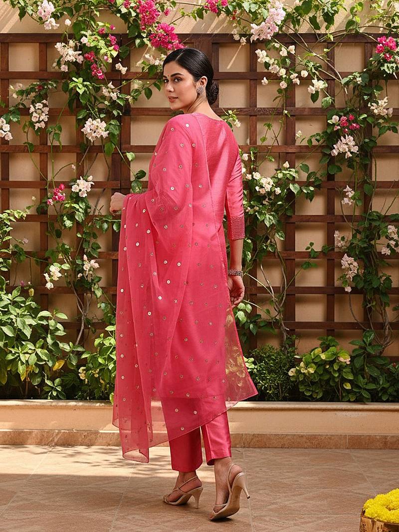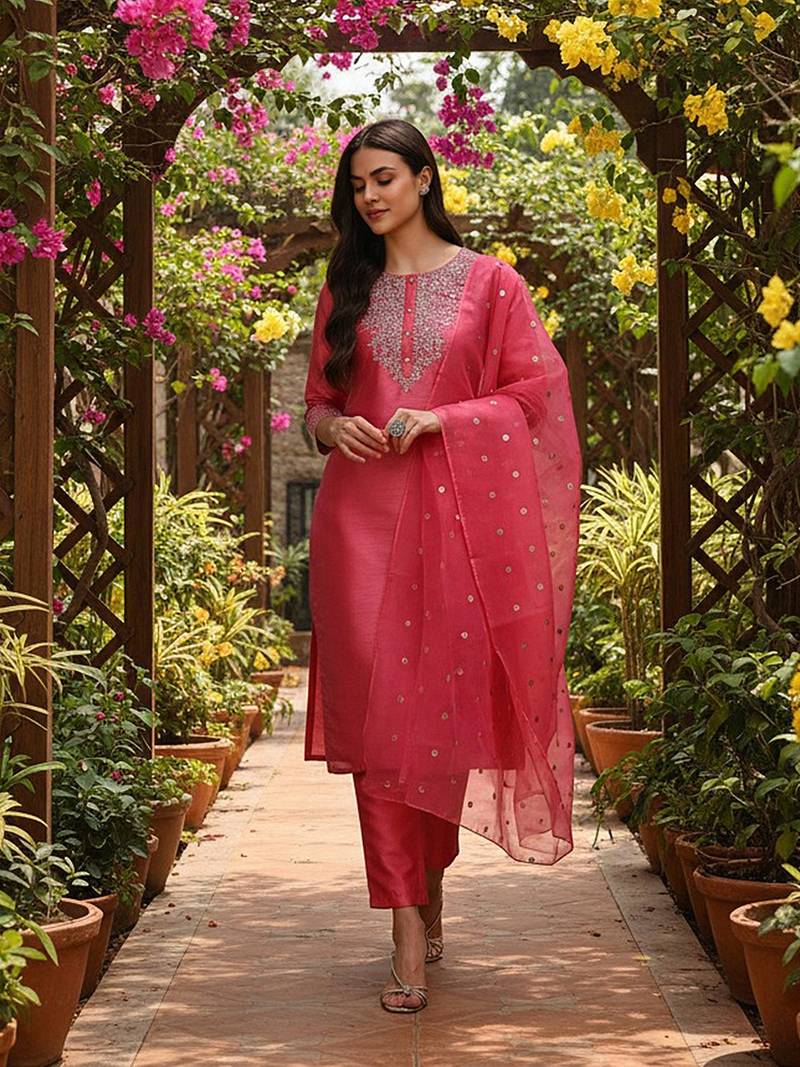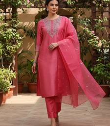 Pink color embroidered poly silk styles kurta trouser with dupatta