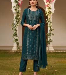 Teal color woven design silk blend styles kurta trouser with dupatta