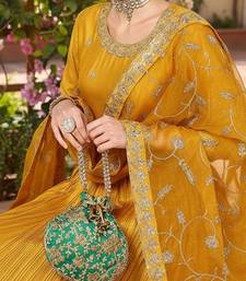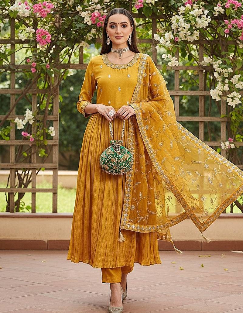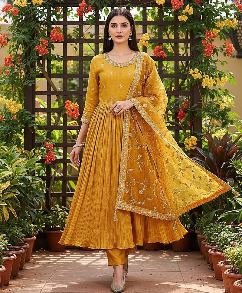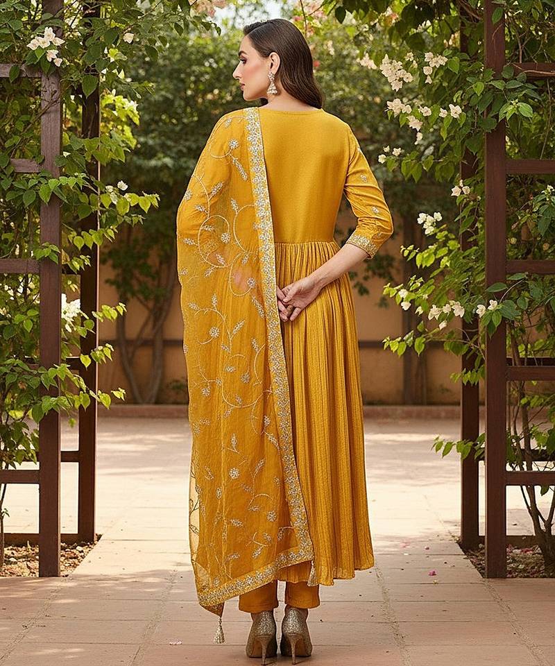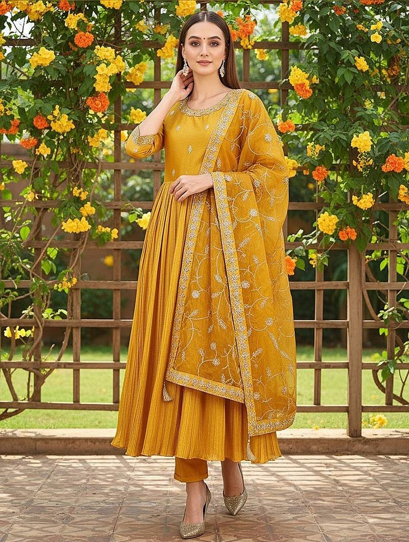 Product Description | Fabric, Color And Design: This Stunning Kurta Set Is A Vibrant Yellow In Color And Is Made Out Of A Silk Blend. Its Kurta Features A Round Neck And It Has Full Sleeves. Further, It Is Covered With Zari Work Near Its Neckline And Bust Area. The Kurta Flares Down To The Floor And Has Micro Pleats. The Set Comes With Matching Bottoms That Are Pant Style And Look Absolutely Stunning. The Outfit Comes Together With A Fashionable Dupatta That Has Matching Zari Work On Its Borders And Body. You Can Wear The Kurta Set To Any Haldi Function And Look Your Charming Best. |