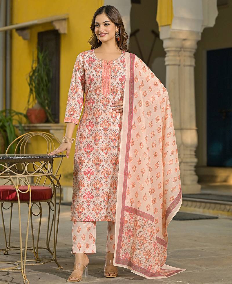 | Product Name | Women Cream Rayon Blend Floral Printed Straight Kurta Trouser And Dupatta | |