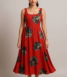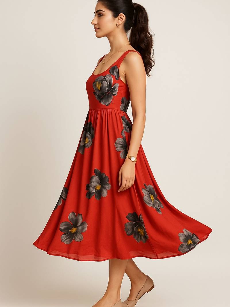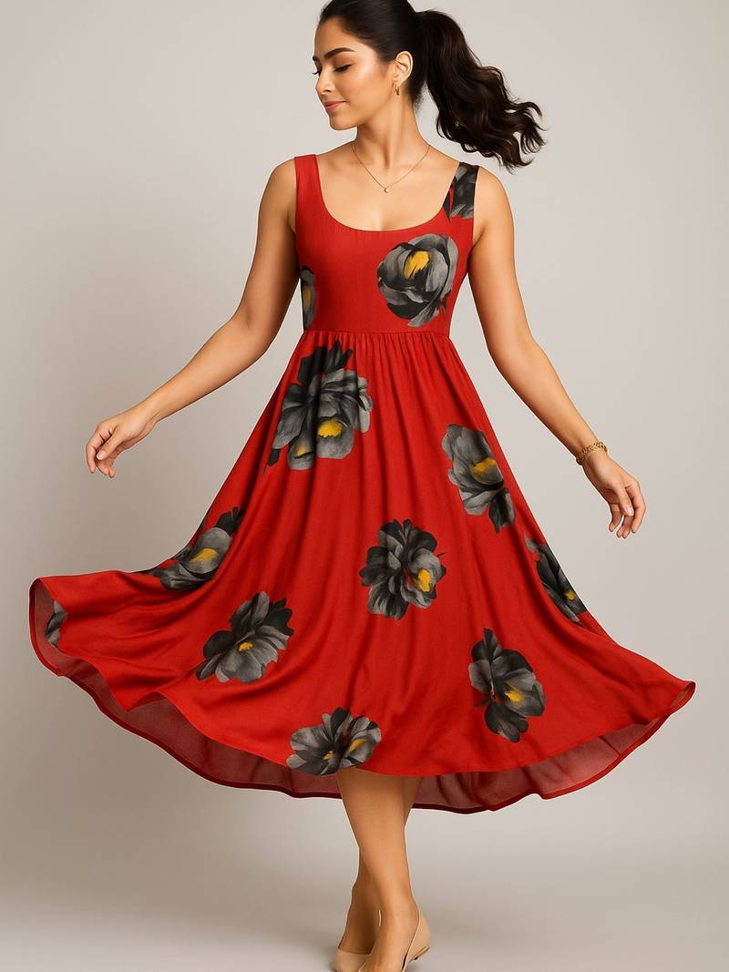 | Product Name | Rust Color Floral Print (Black & Grey Flowers With Yellow Accents) Dress | |
