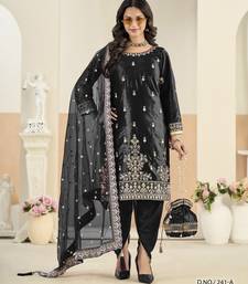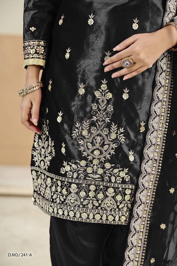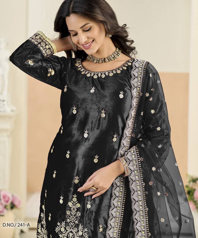 Embroided black salwar suit made of ice velvet with net dupatta semi stitched