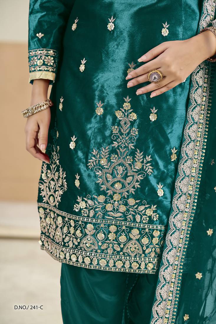 Embroided rama salwar suit made of ice velvet with net dupatta semi stitched