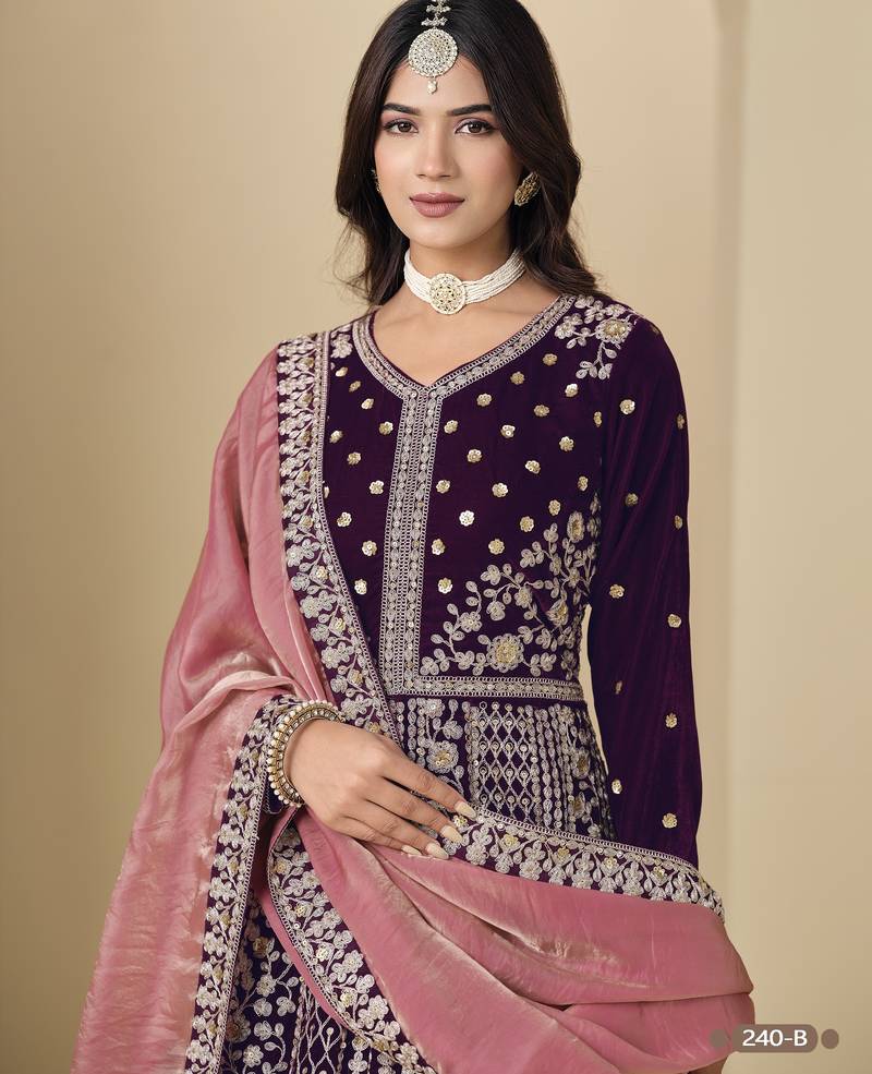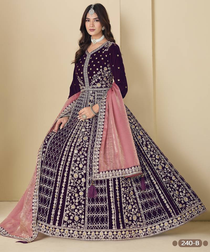 Purple velvet anarkali suit with dupatta semi stitched