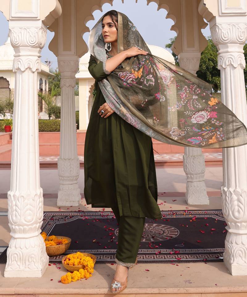 | Product Name | Mahendi Color Cotton Silk Fabric Designer Embroidered Heavy Ceremonial Wear Salwar Kameez | |