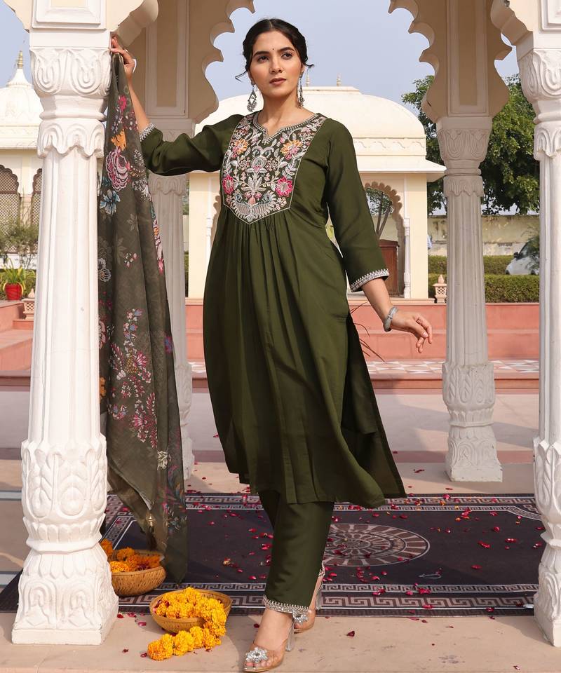 Mahendi color cotton silk fabric designer embroidered heavy ceremonial wear salwar kameez