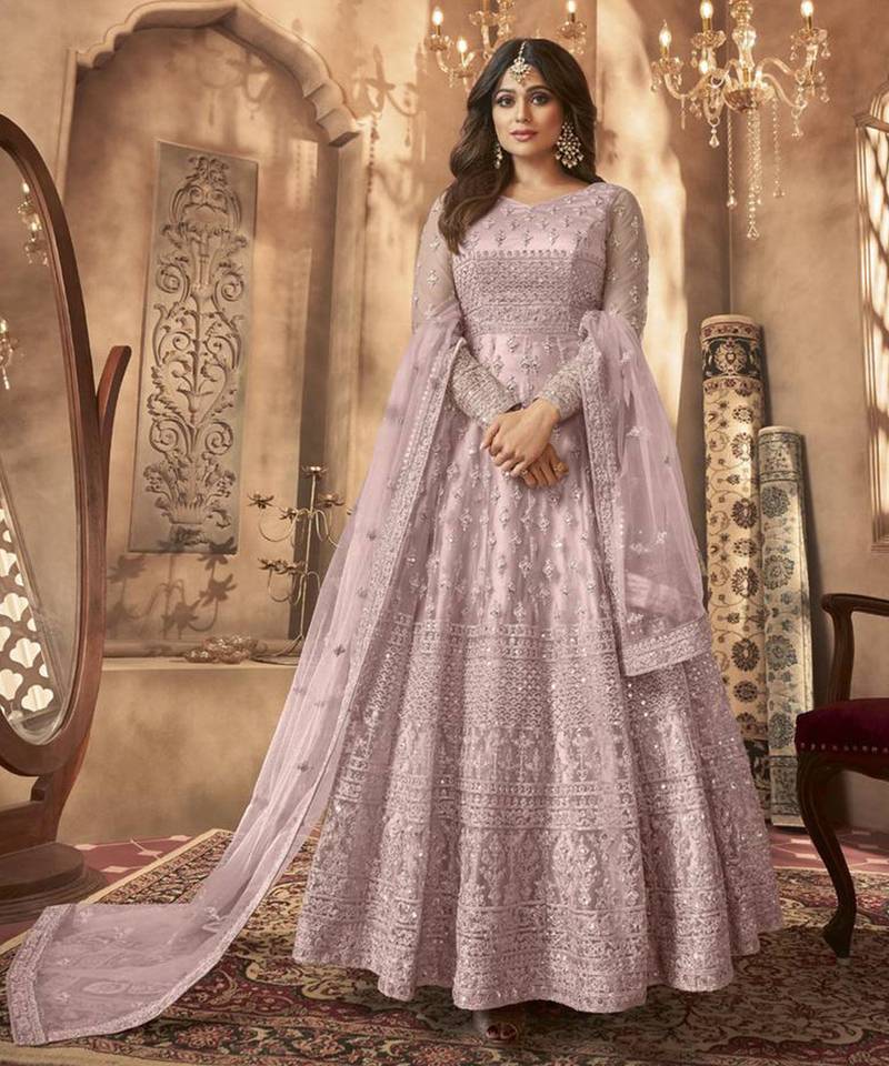 Purple net anarkali embroidered work festival long salwar suit dupatta semi stitched