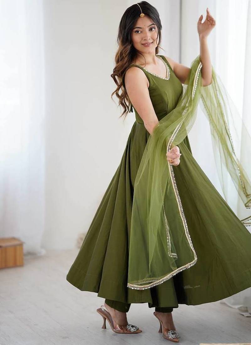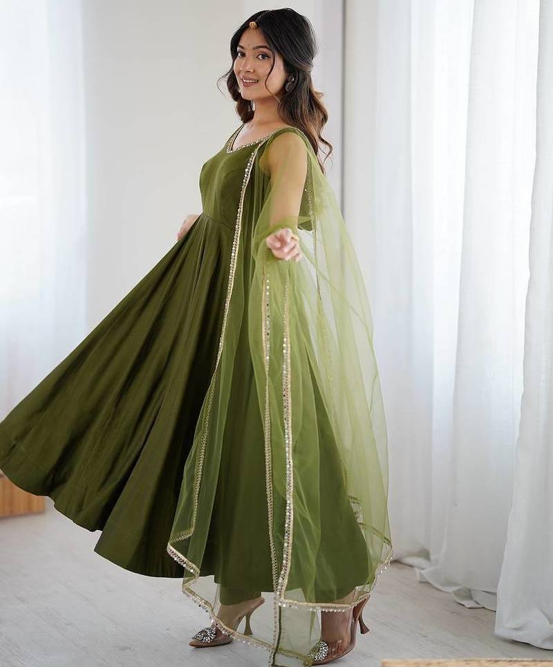 Pure romansilk chanderi fabric fully flare anarkali with pant dupatta set ready to wear stitched