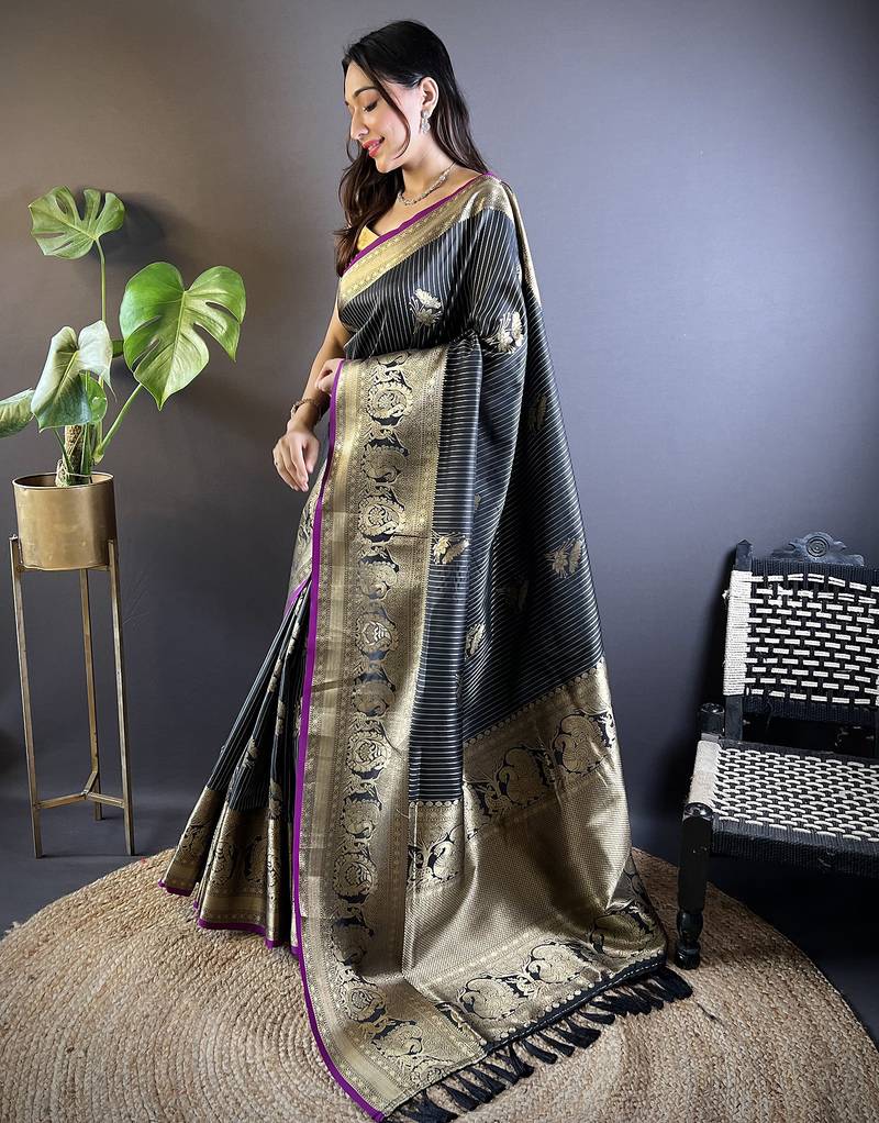 | Product Description | Rich Black Silk Paired With Chic Striped Patterns And Intricate Floral Motifs Creates A Bold And Elegant Ethnic Look That Enhances Any Festive Wardrobe. This Stylish Saree Brings Timeless Beauty To Celebrations And Special Occasions.