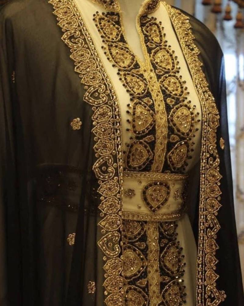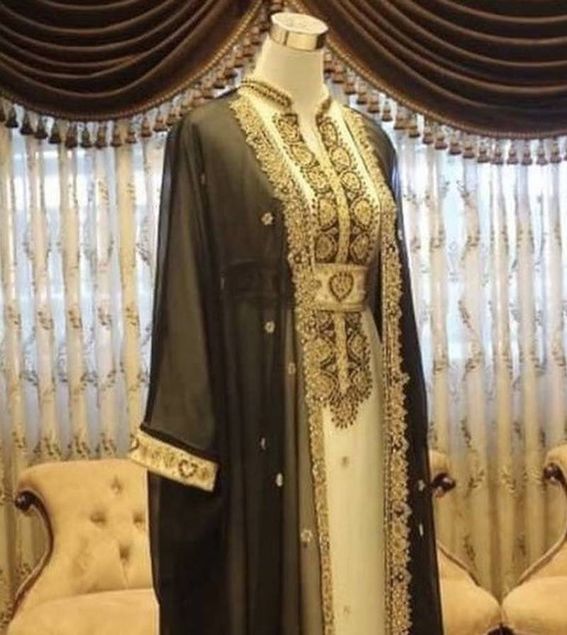 | Product Description | Exuding Grace And Grandeur, This Black & White Kaftan Dress Makes A Striking Statement At Wedding Celebrations, Formal Gatherings, And Grand Evening Events. Crafted From Soft, Flowing Georgette, It Features A Full Length Silhouette With A Flattering V Neckline That Enhances Its Fluid Elegance. Intricate Gold And Black Toned Zari Embroidery Paired With Delicate Beadwork Highlights The Neckline, Shoulders, And Center Panel, Extending Beautifully Along The Front Edge. The Flowing Cape Style Sleeves Add A Touch Of Drama And Movement, Creating An Ethereal Presence. With Its Timeless Palette And Exquisite Detailing, This Gown Captures Luxury And Poise In Every Fold. |