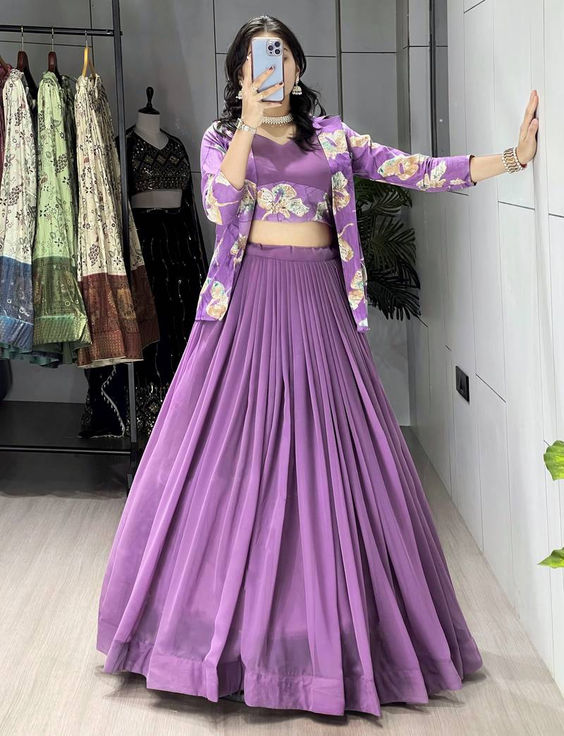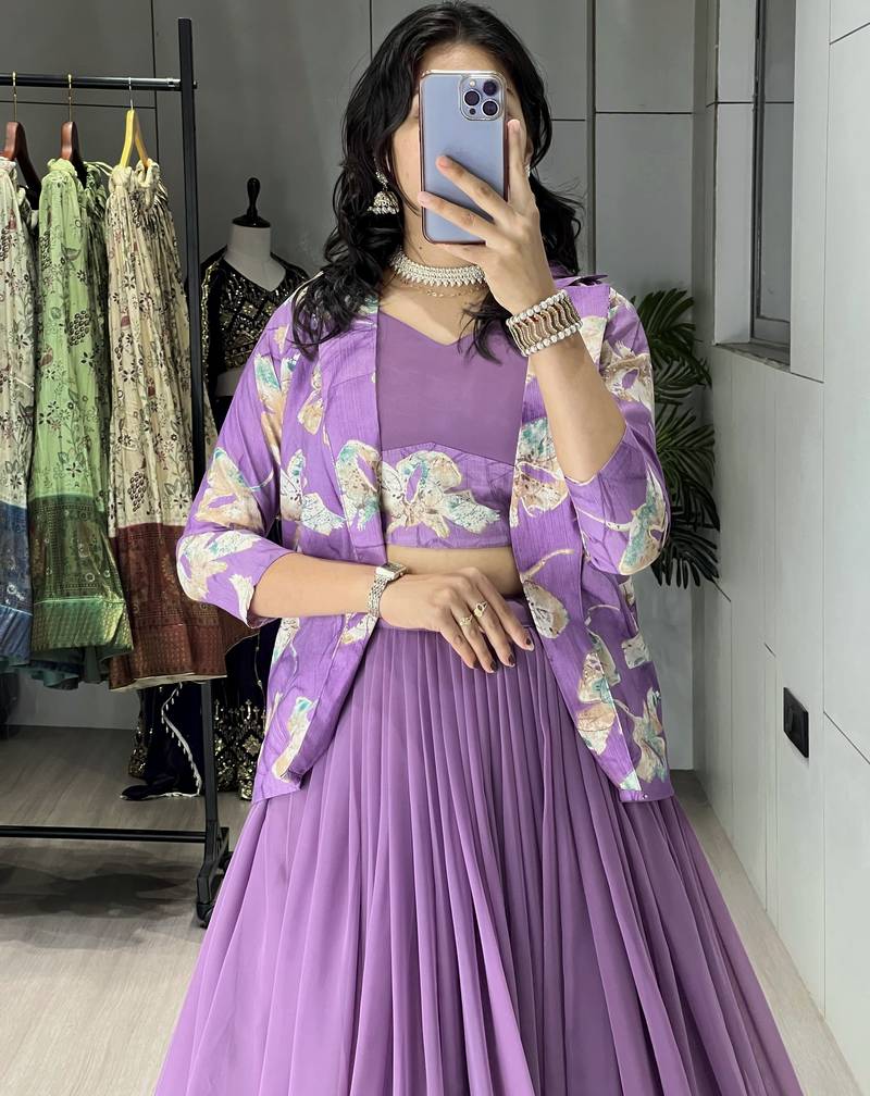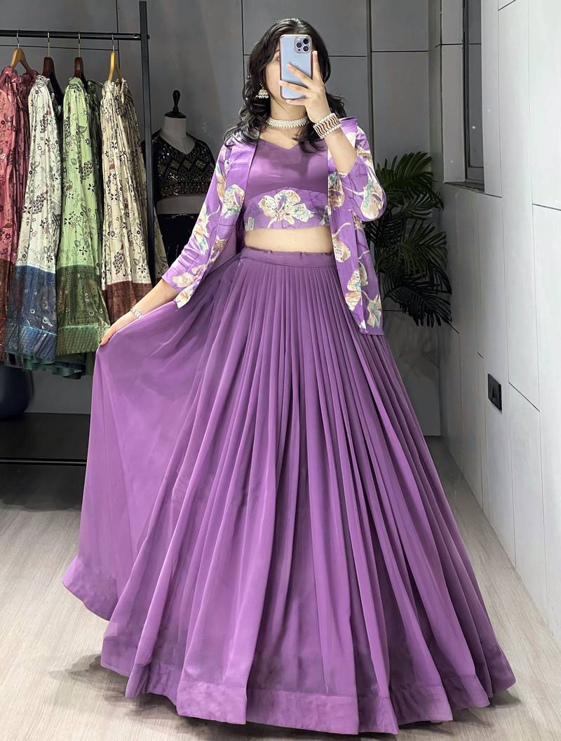 Lavender color plain foil work heavy gorgette lehenga fully stitched blouse & koti