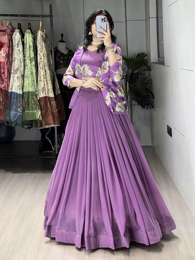 | Product Name | Lavender Color Plain Foil Work Heavy Gorgette Lehenga Fully Stitched Blouse & Koti | |