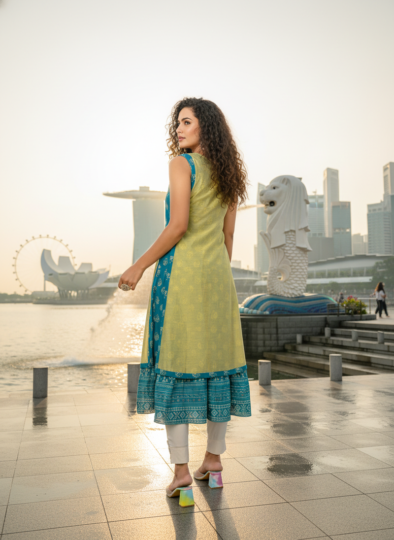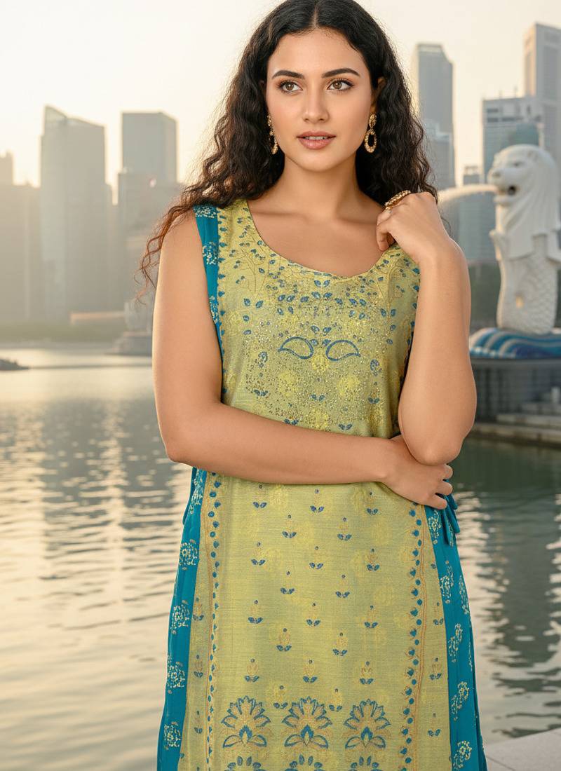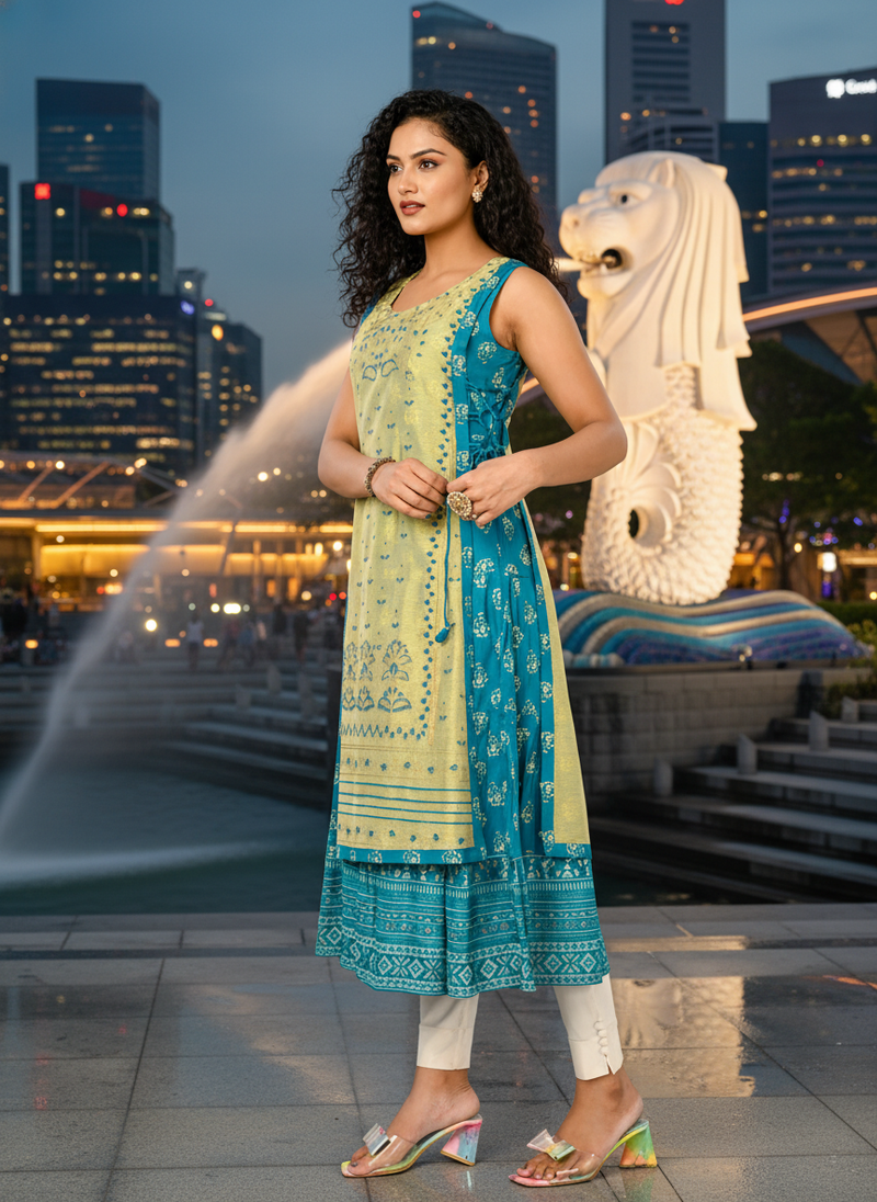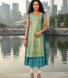| Product Name | Derk Green Cotton Inner With Chanderi Layered Jacket Kurti Set | |