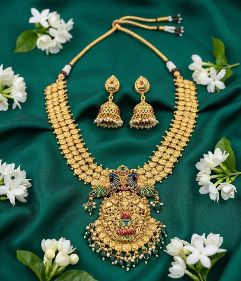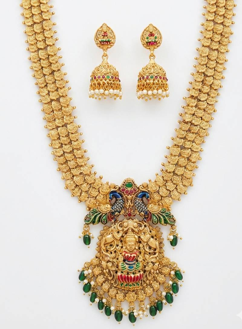 | Product Name | Antique Gold Temple Jewelry Set: Lakshmi Peacock Long Haram & Jhumkas | Traditional Bridal Ethnic Wear | |