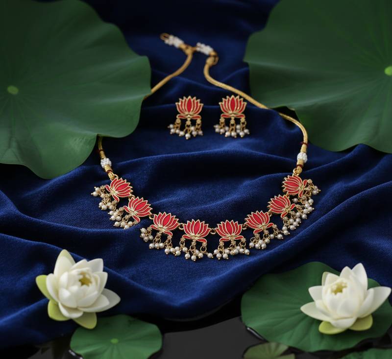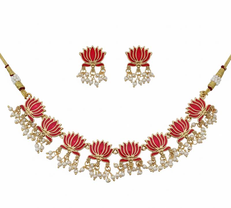 Make A Graceful Statement With This Traditional Handcrafted Gold Plated Lotus Kundan Necklace Set, Designed To Celebrate Timeless Indian Artistry. Inspired By The Elegance Of Blooming Lotuses, This Ethnic Necklace Set With Matching Earrings Features Intricate Craftsmanship, Rich Enamel Detailing, And Delicate Pearl Drops That Add Regal Charm To Every Look.