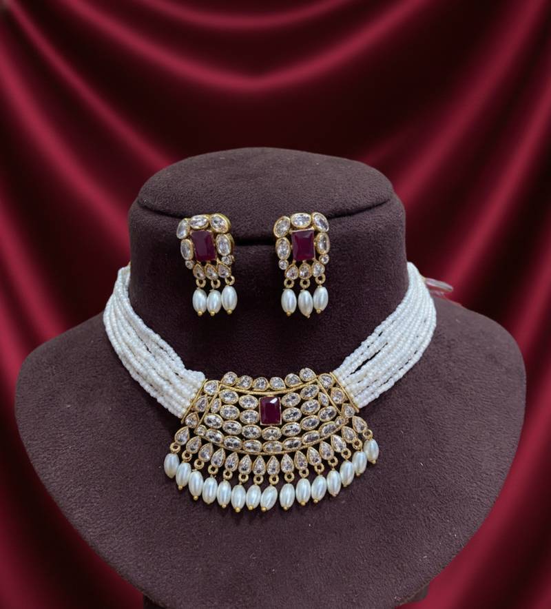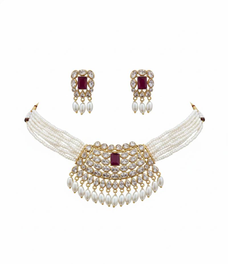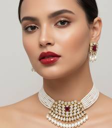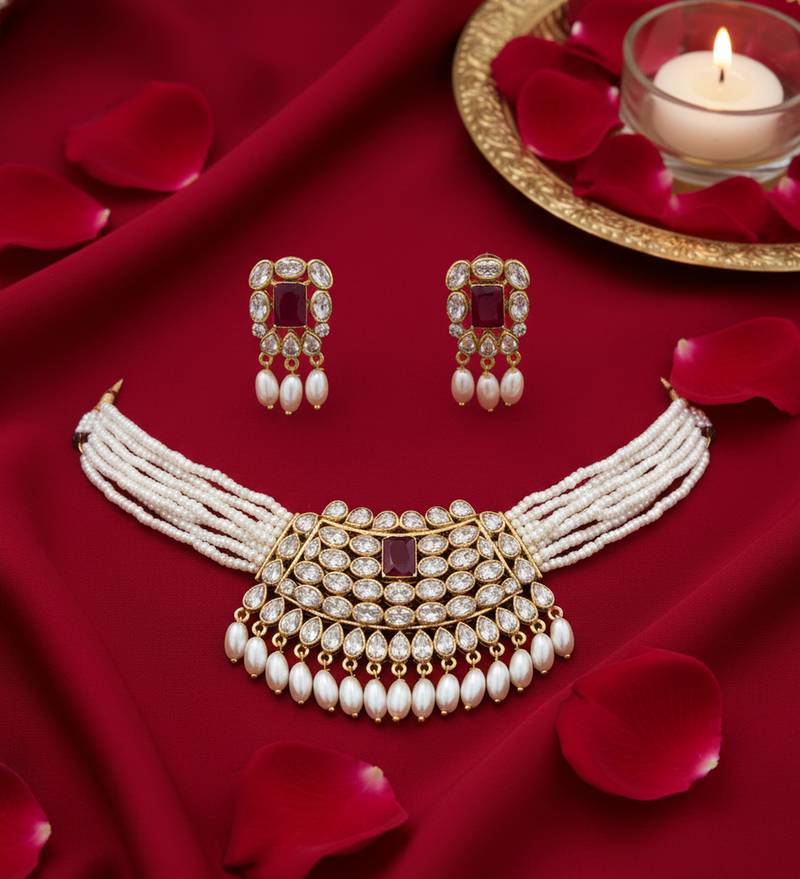 | Product Description | Elevate Your Ethnic Elegance With This Traditional Handcrafted Kundan Pearl Choker Necklace Set, Designed To Add Timeless Royal Charm To Your Jewelry Collection. Featuring A Luxurious Gold Plated Finish, Dazzling Kundan Stones, Center Accents, And Delicate Pearl Drops, This Ethnic Necklace Set Is A Perfect Blend Of Heritage Craftsmanship And Contemporary Appeal. Expertly Handcrafted By Skilled Artisans, This Statement Choker Necklace With Matching Earrings Reflects Classic Indian Jewelry Aesthetics Loved Worldwide. The Layered Pearl Strands And Intricate Stone Setting Create A Regal Look That Instantly Enhances Bridal, Festive, And Party Wear. Key Features & Details Product Type: Choker Necklace Set With Earrings Design: Traditional, Handcrafted Ethnic Jewelry Material: Gold Plated Alloy, Kundan Stones, Pearl Beads Finish: Premium Polish For Long Lasting Shine Style: Bridal, Royal, Ethnic, Statement Jewelry Perfect For Indian Weddings & Bridal Wear Festivals, Poojas & Cultural Celebrations Engagements, Receptions & Parties Styling With Sarees, Lehengas, Anarkalis & Gowns This Handcrafted Ethnic Jewelry Set Pairs Beautifully With Silk Sarees, Bridal Lehengas, And Indo Western Outfits, Making It A Versatile Choice For Customers . ✨ Add A Touch Of Royal Tradition To Your Look—Shop Now And Make Every Occasion Unforgettable With This Elegant Kundan Pearl Choker Set. |