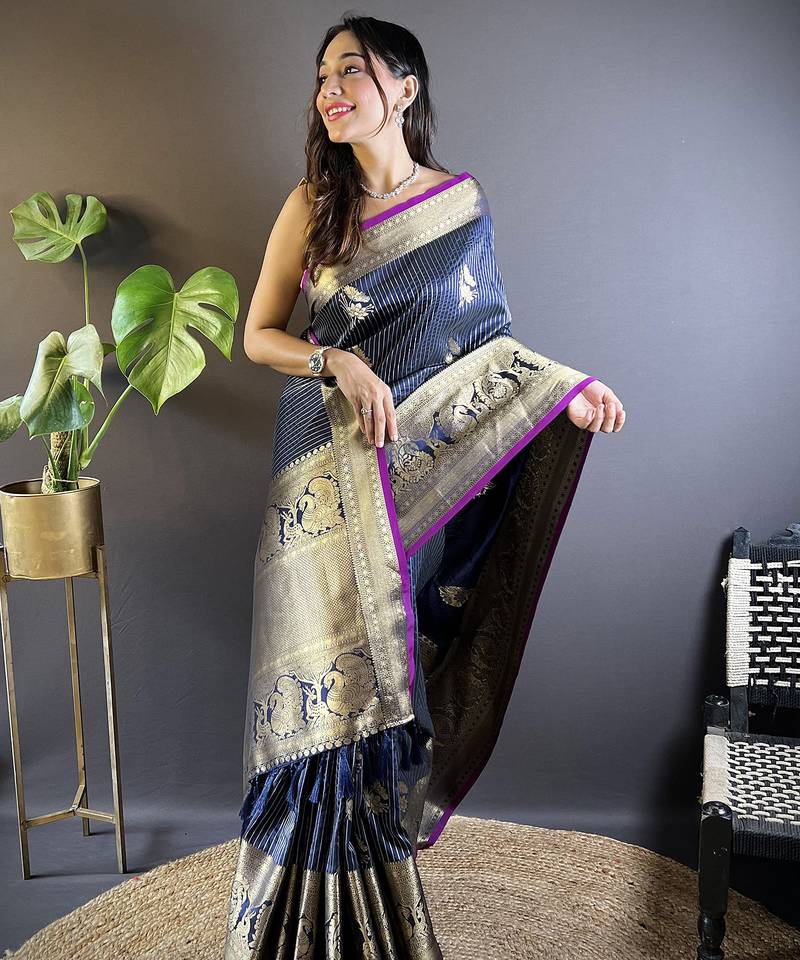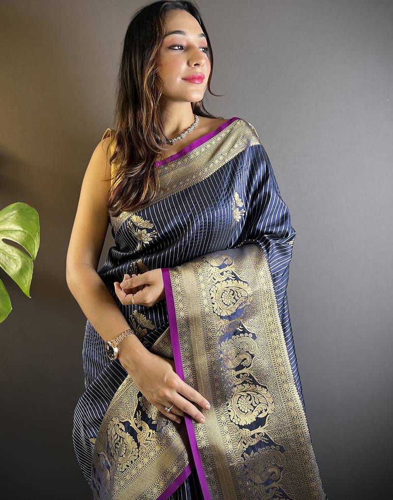 Striped with floral motifs navy blue soft silk blend leheriya saree