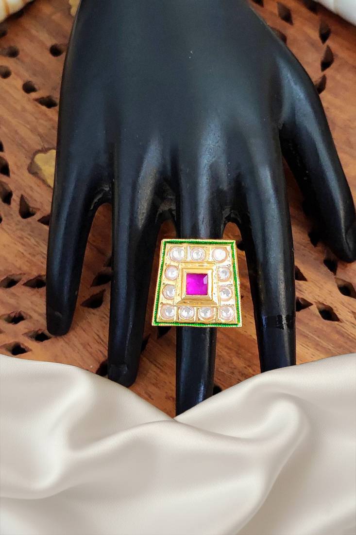 High gold square kundan finger ring for women adjustable designer women and girls