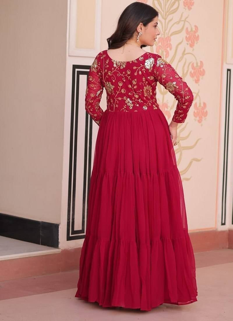 This Designer Anarkali Gown In Rani Pink Showcases Faux Blooming Fabric Adorned With Sequins And Zari Embroidery. Fully Lined With Soft Cotton, It Offers Comfort From Top To Bottom. The 12 Meter Flare Adds Volume, Complemented By An A Line Cut That Drapes Beautifully. The Fancy V Neck And Regular Full Sleeves Bring A Stylish Touch, While The 52 54 Inch Length Suits Traditional And Festive Occasions. A Unique Blend Of Embroidered Detail And Flowing Silhouette Makes It A Standout Piece.