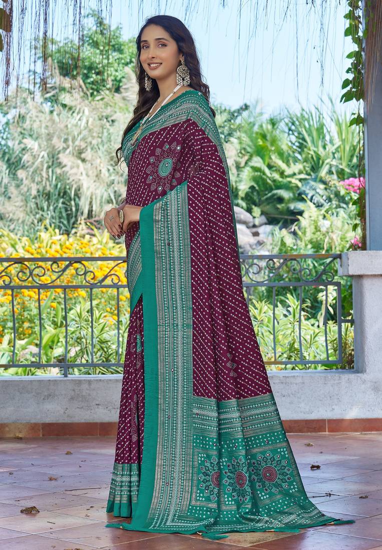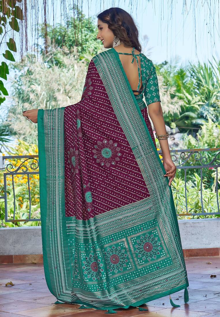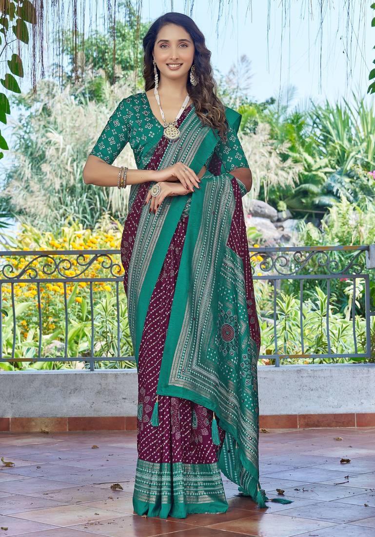 | Product Name | Purple Color Velvet Tussar Silk Blend Fabric Tradtional Woven Saree With Bandhej Print | |