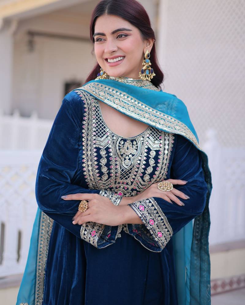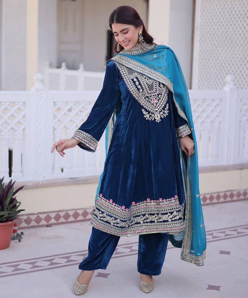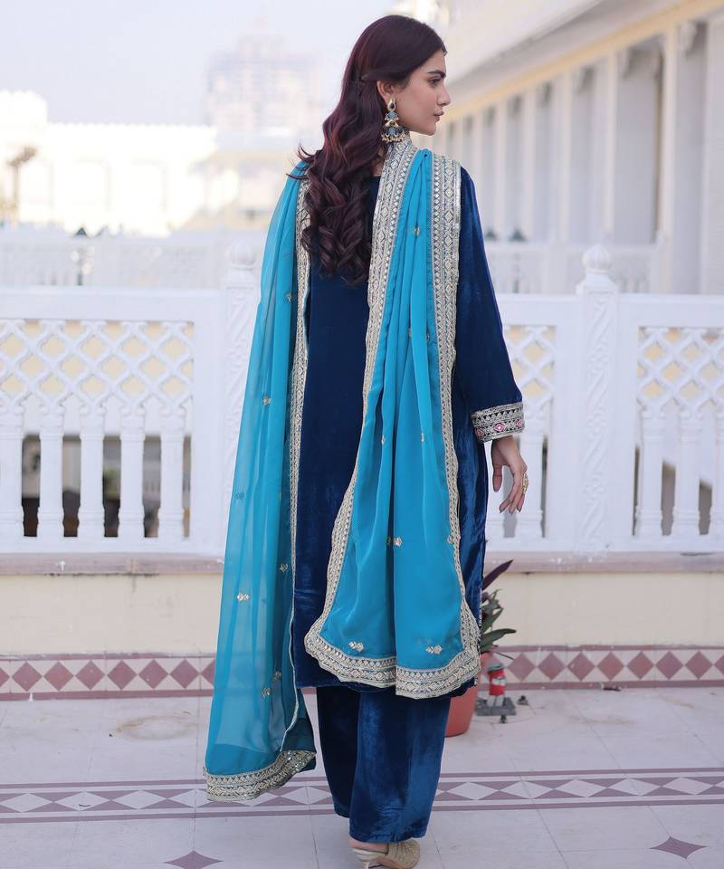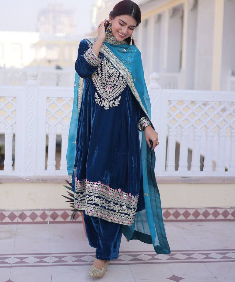 | Product Description | Attractive These Beautiful Looking Readymade Suit With Dupatta.These Top Bottom Are Velvet And Dupatta Is Fabricated On Tabby Silk.Its Beautified With Designer Codding,Sequance Embroidery Work. |