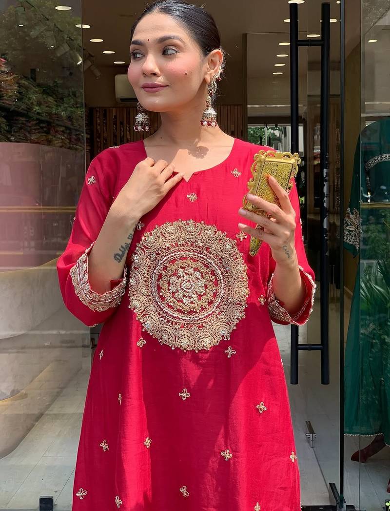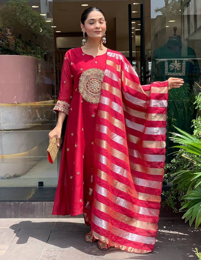 Red silk blend embroidered partywear salwar kameez