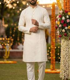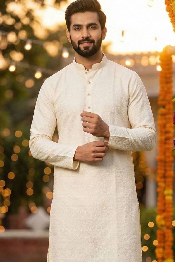 | Product Description | Elegant Off White Silk Jacquard Kurta With Cotton Pyjama For Traditional And Ceremonial Wear |