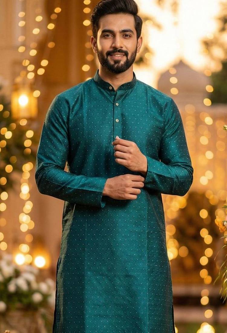 | Product Description | Stylish Rama Green Silk Jacquard Kurta With Cotton Pyjama For Festive And Wedding Occasions |