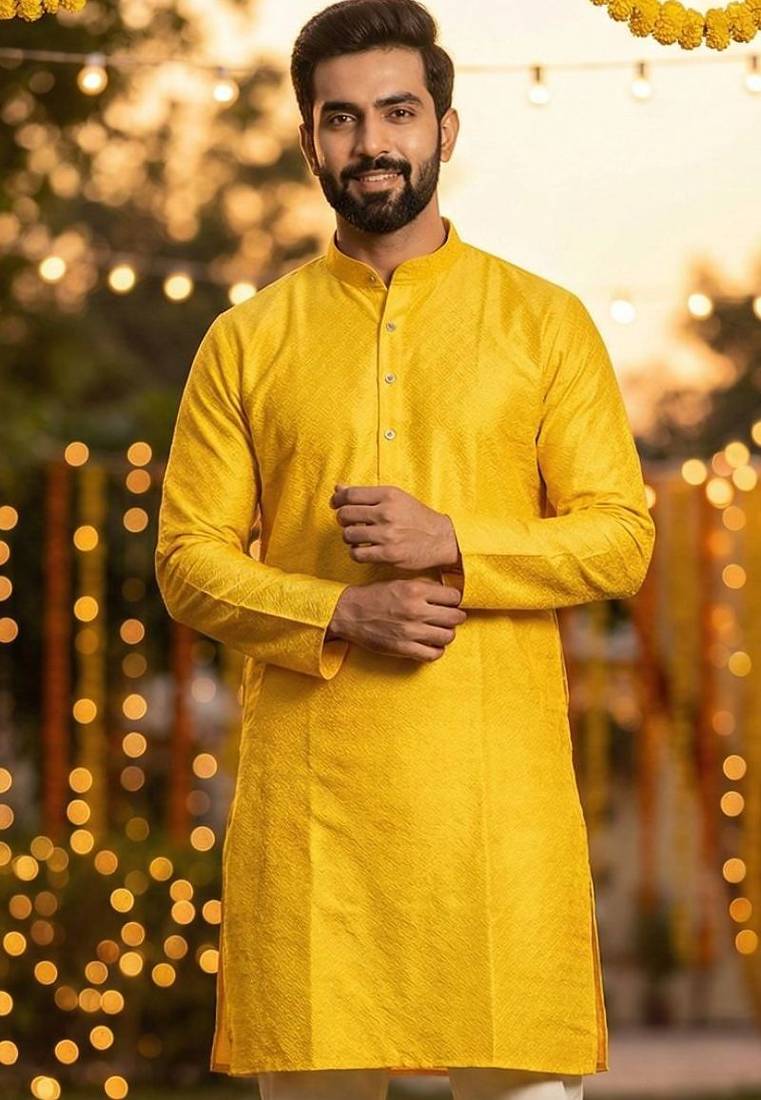 | Product Description | Bright Yellow Silk Jacquard Kurta With Cotton Pyjama, Ideal For Haldi And Festive Functions |