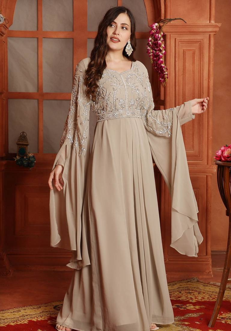 | Product Name | Silver Crystal Embellished Empire Waist Dress In Beige | |