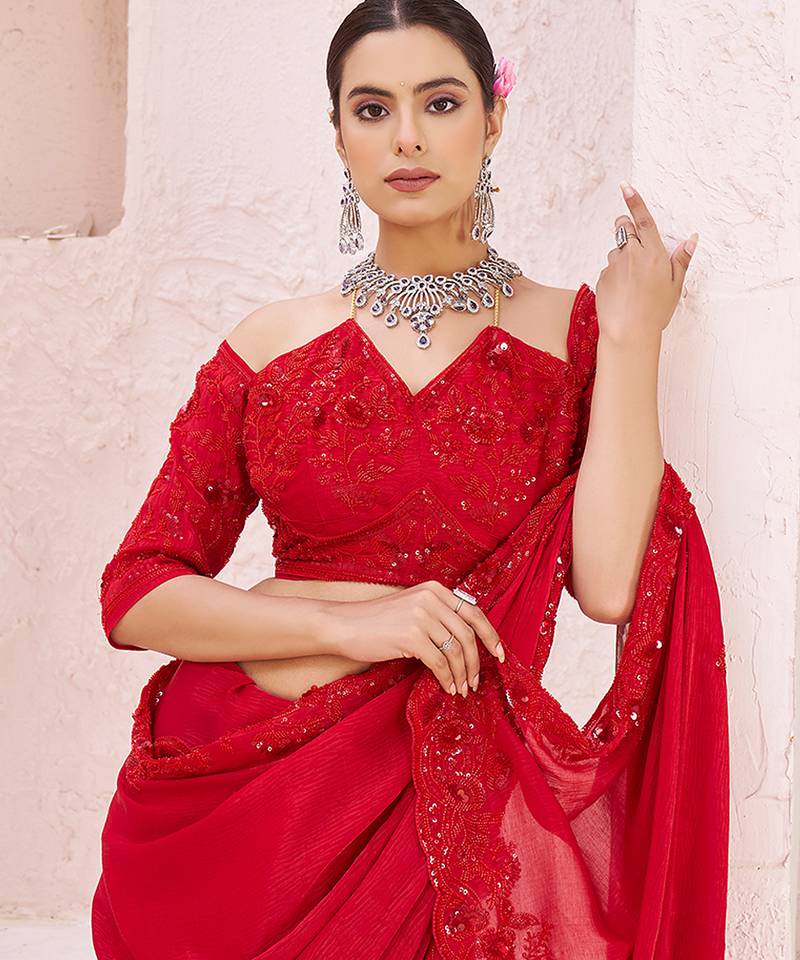 This Red Crepe Saree Features Refined Embroidery That Balances Richness With Modern Appeal. The Smooth Texture And Graceful Fall Make It Flattering And Versatile, Perfect For Festive Lunches, Family Celebrations, And Semi Formal Ethnic Events With Confident Style.