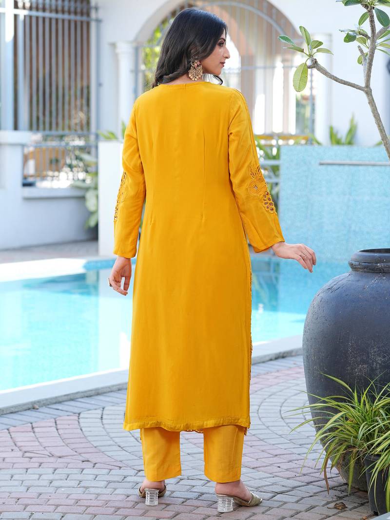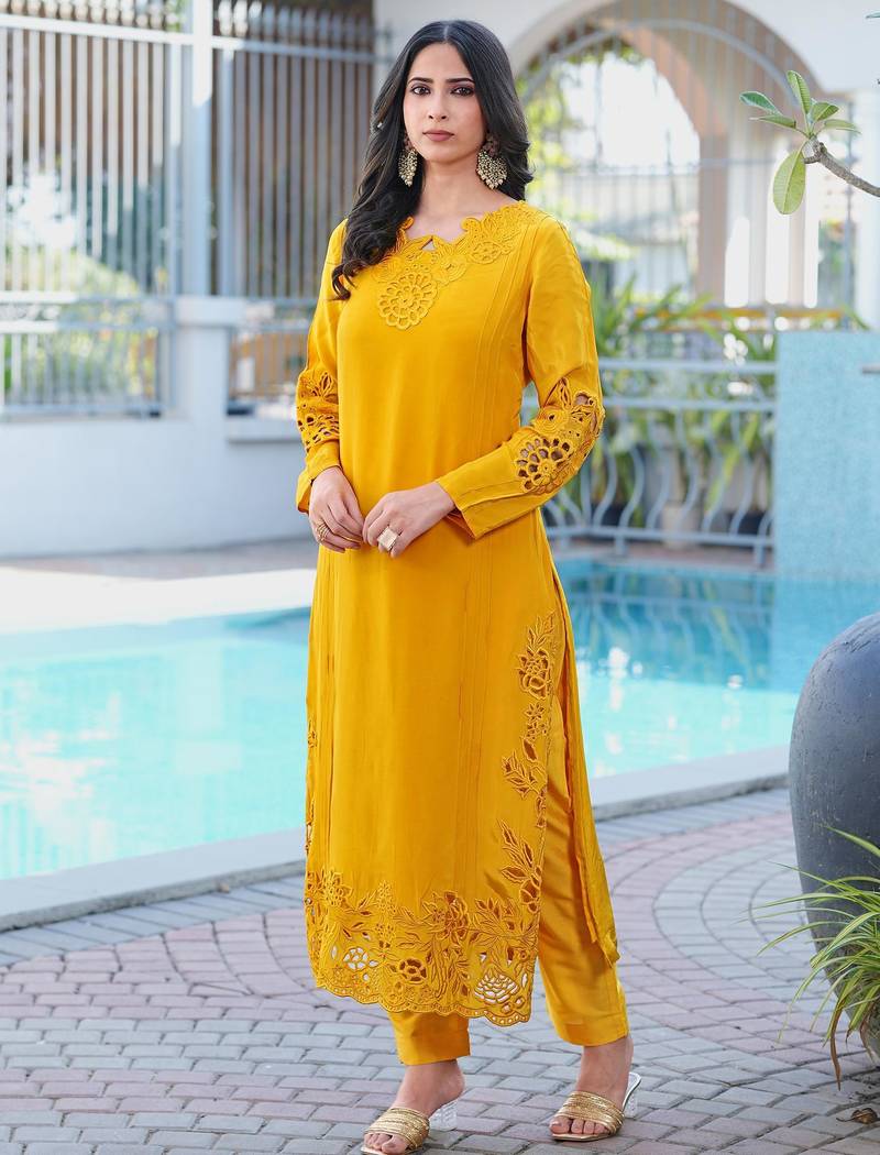 | Product Description | Yellow Art Silk Kurta With Intricate Cutwork Embroidery On The Neckline, Sleeves, And Hem, And Scalloped Lace Detailing Along The Front Slit. |