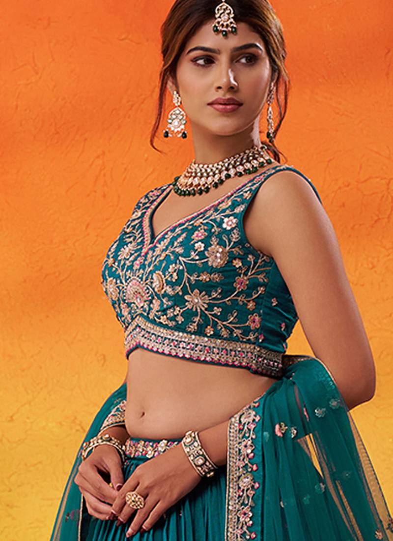 | Product Description | • Lehenga: Made Of Premium Quality Teal Georgette Fabric Full Flair Semi Stitched Pleated Lehenga With Moti, Sequins And Cording Work Has A Thread Embroidery Work. Has A Thread Work Border On The Hemline.