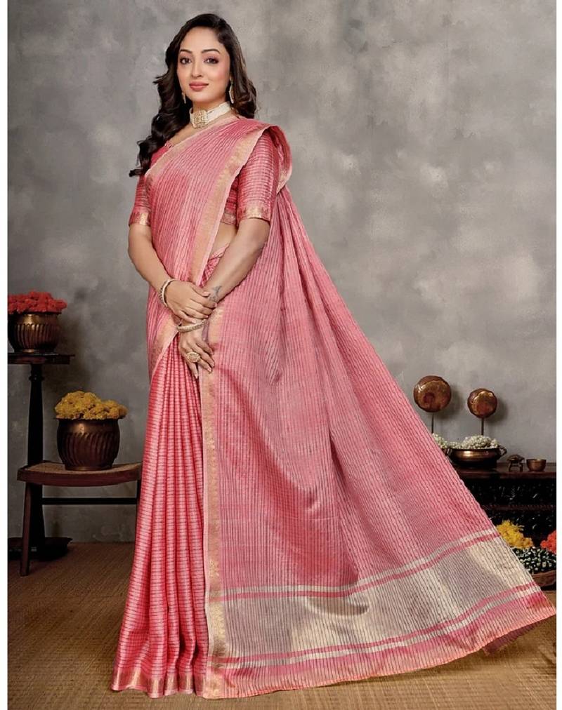 Pink color silk blend couple combo men's kurta & pajama & women saree set
