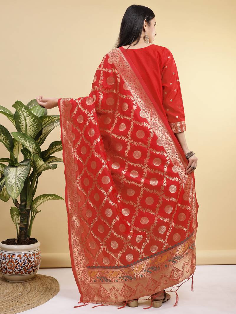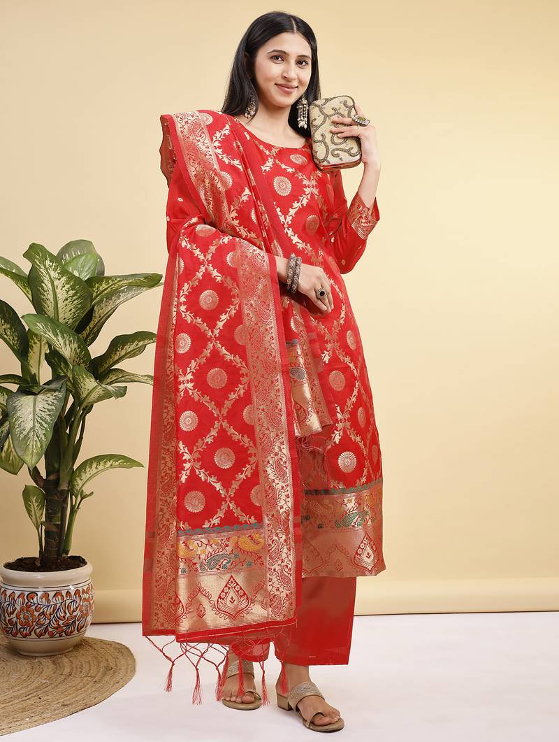 | Product Name | Readymade Red Color Pure Banarasi Silk Top Pent Dupatta Set | |