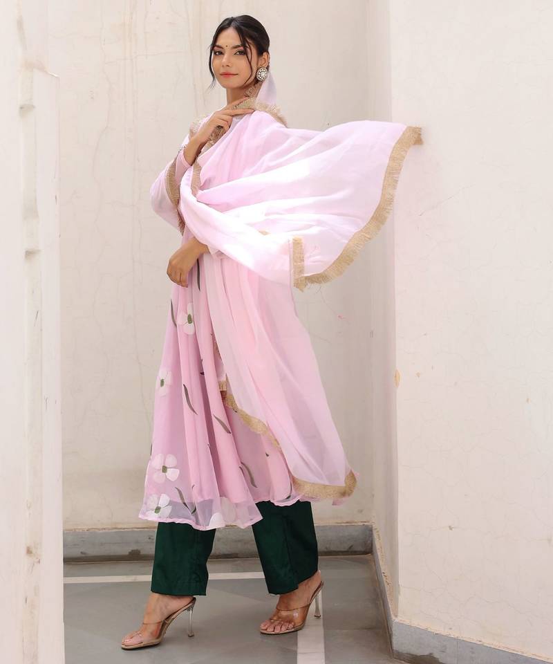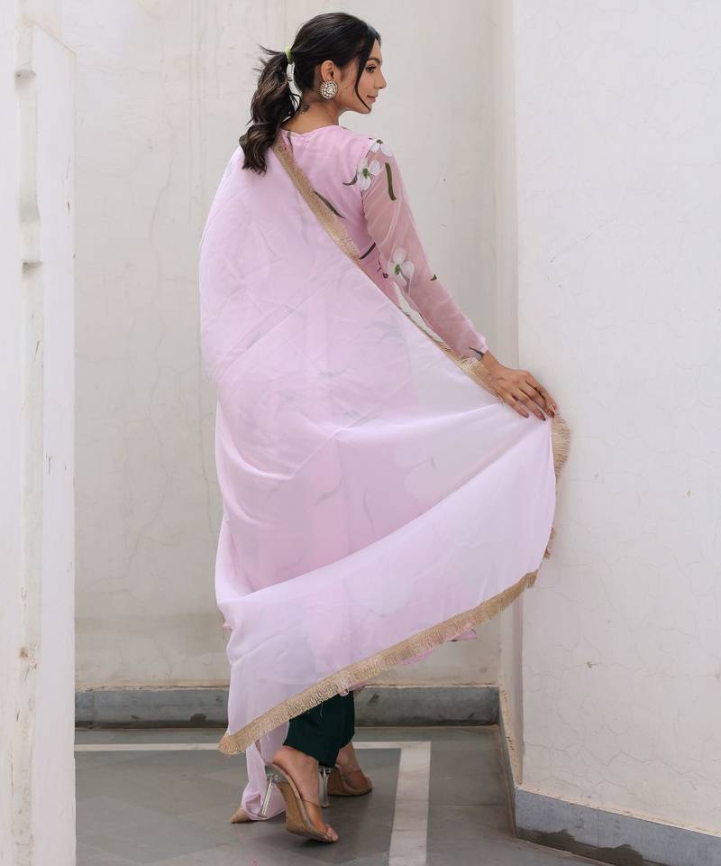Blush pink floral printed anarkali kurta with trouser set stitched