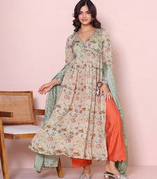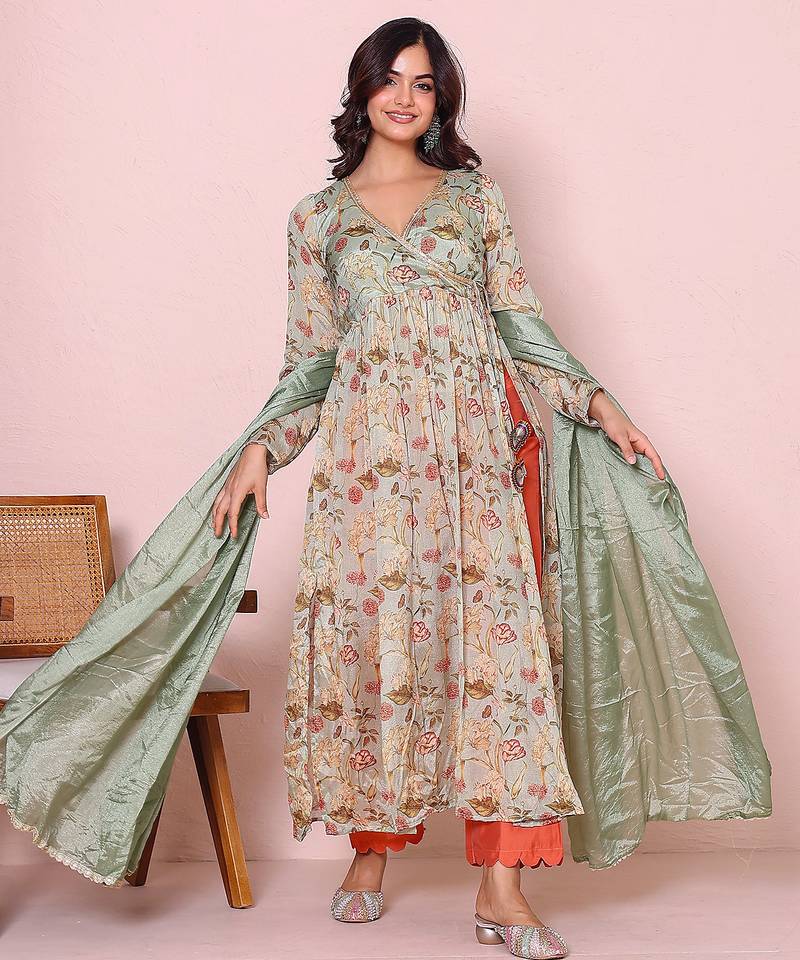Green floral printed angrakha kurta with palazzo set stitched