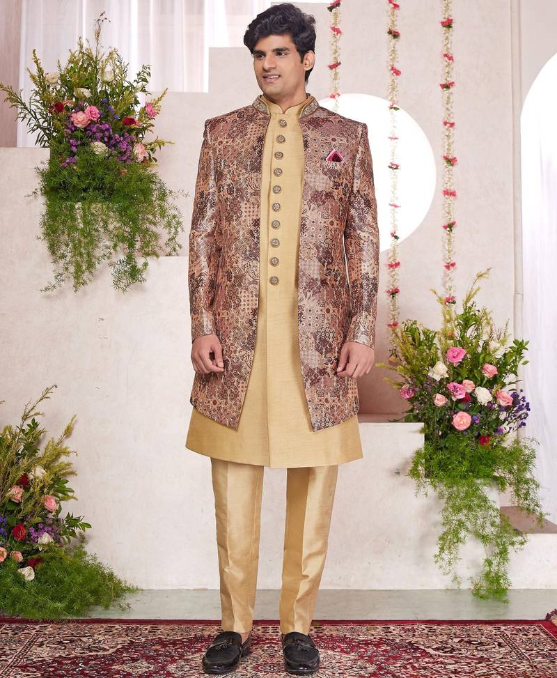 Brown computer thread work on digital print silk 3 peice jacket set for men