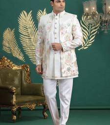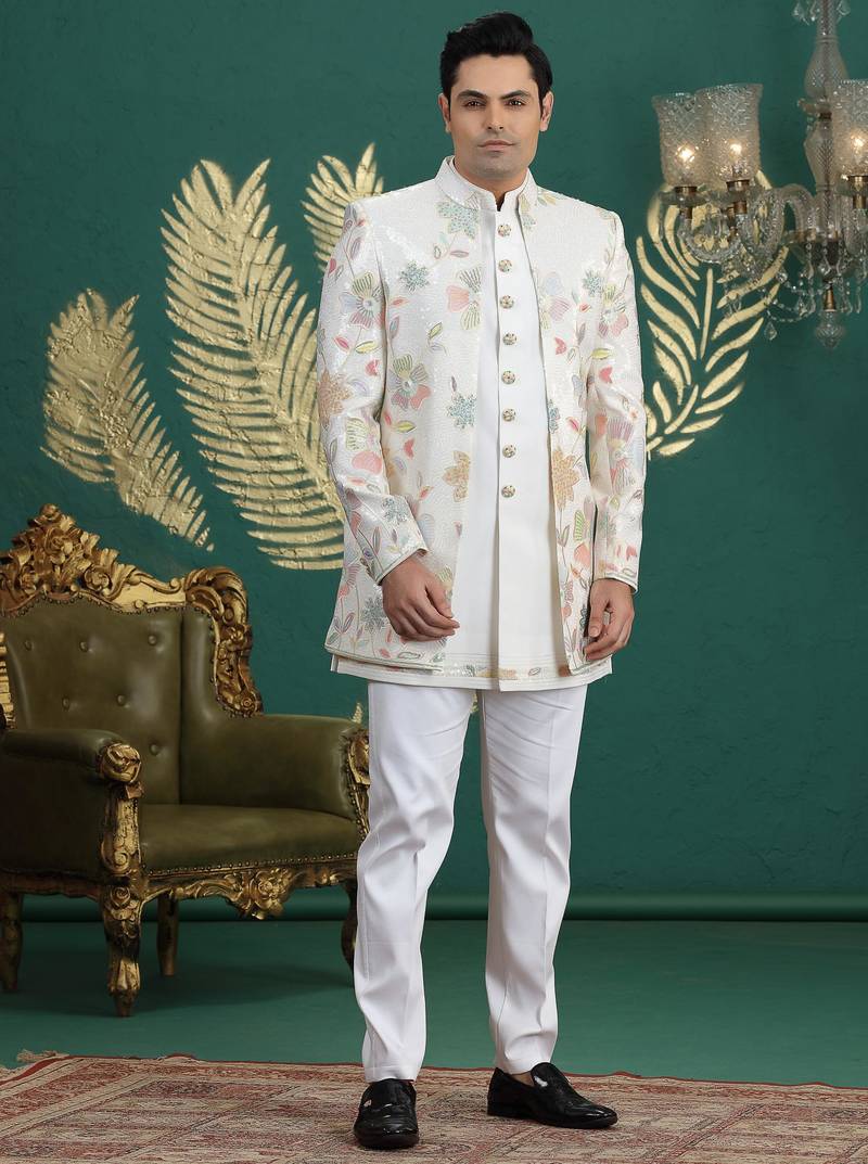 | Product Name | Cream Computer Thread Work On Art Silk 3 Peice Indo Western Set For Men | |