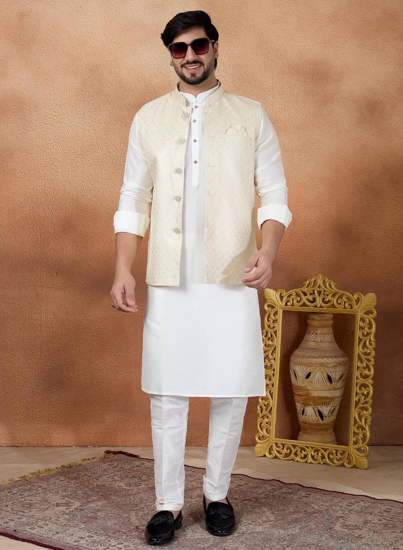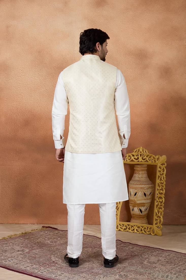 Product Name Cream Jacquard 3 Peice Kurta Jacket Set For Men