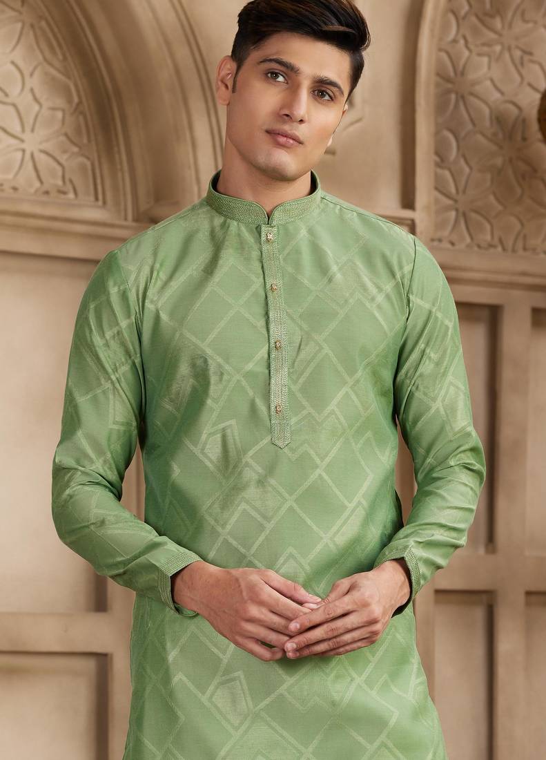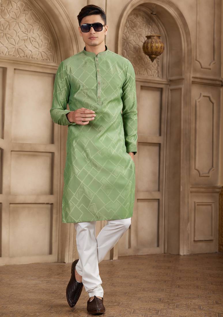 Green art silk kurta set for men