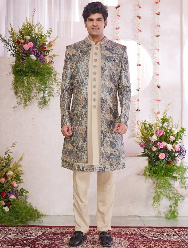 | Product Name | Green Computer Thread Work On Digital Print Silk 3 Peice Jacket Set For Men | |
