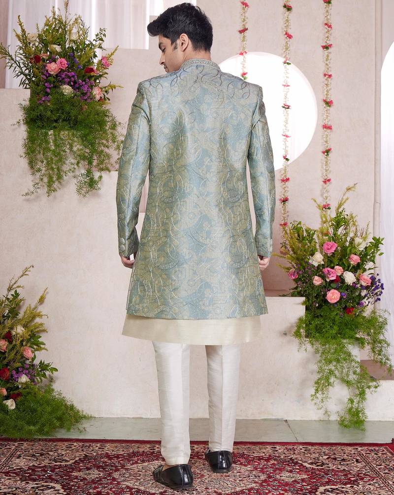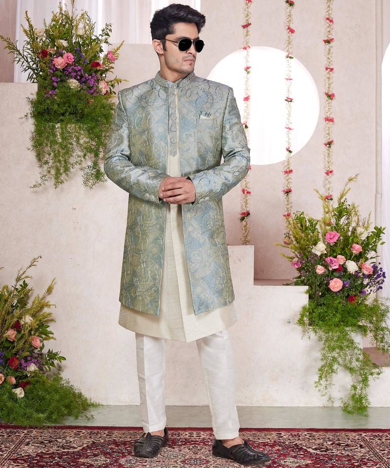 | Product Name | Green Computer Thread Work On Digital Print Silk 3 Peice Jacket Set For Men | |