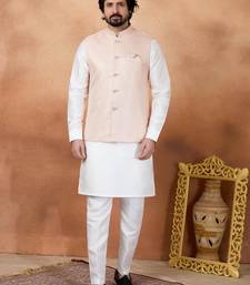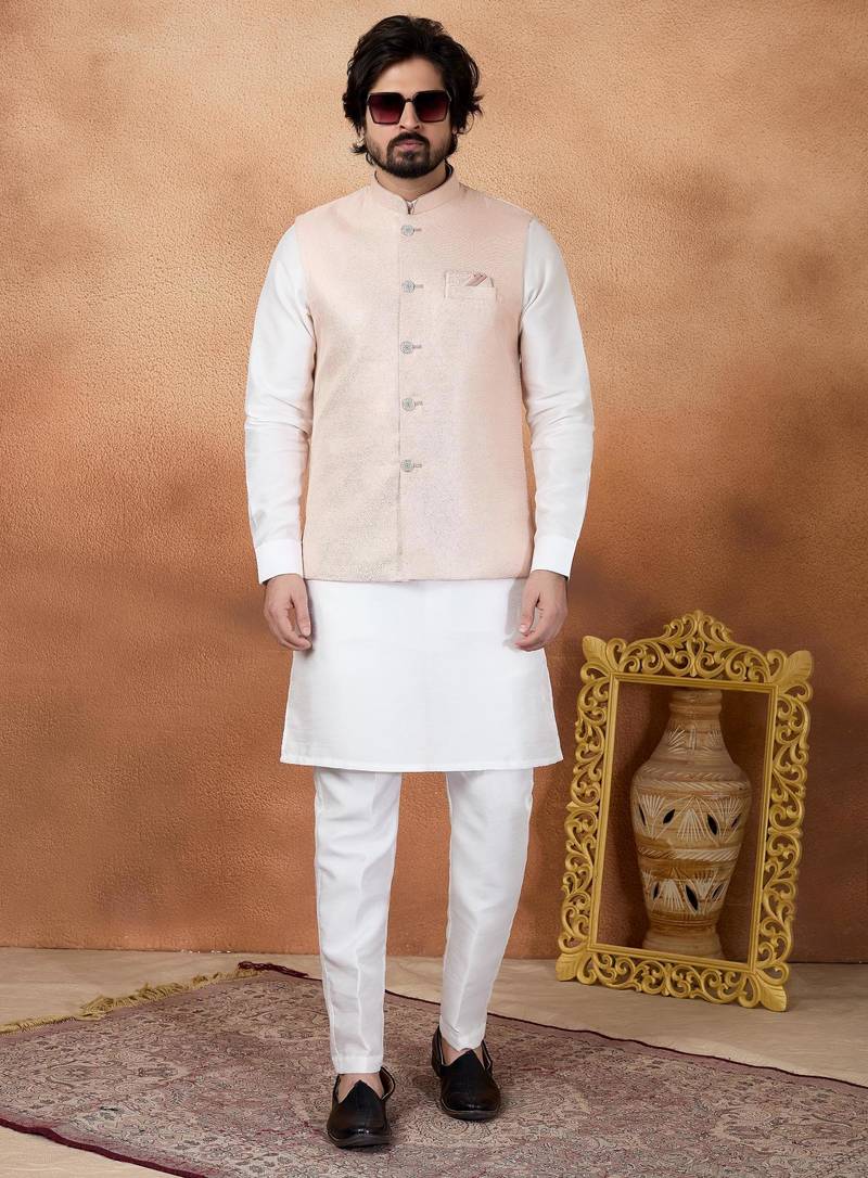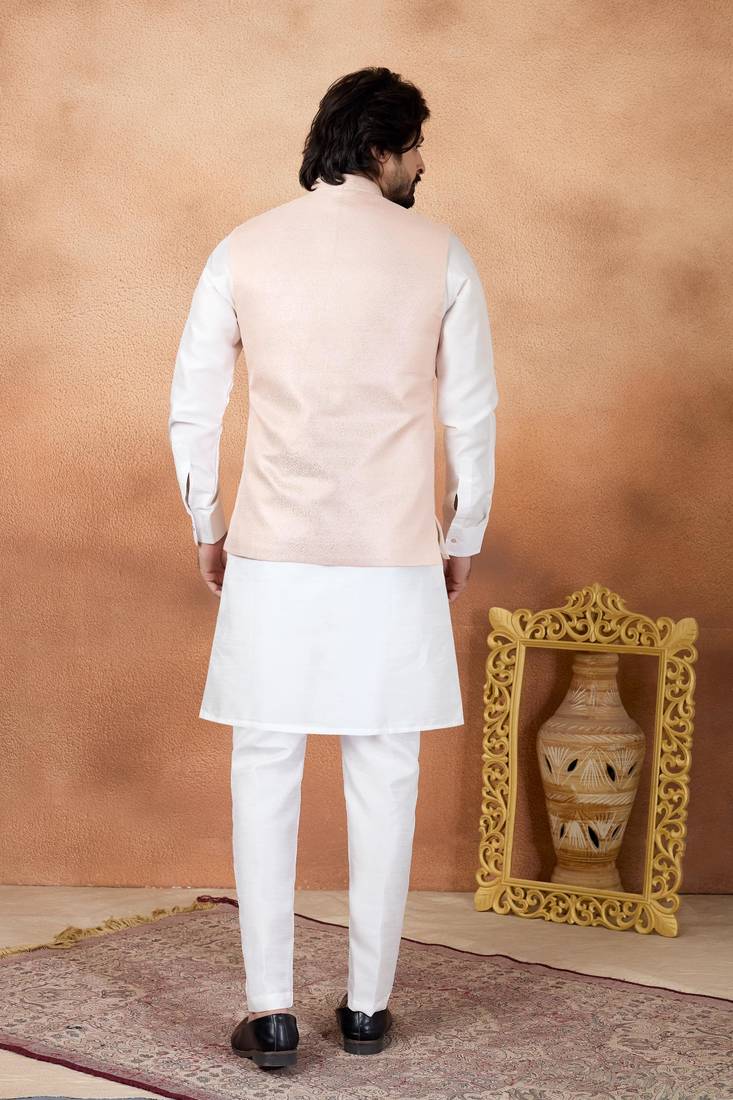 Product Name Pink Jacquard 3 Peice Kurta Jacket Set For Men