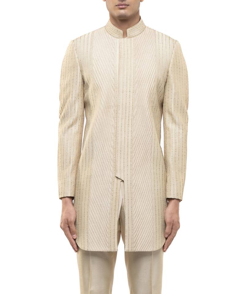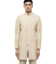 Beige embroidered silk sherwani set