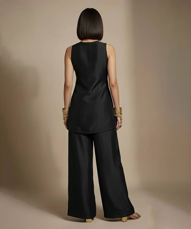 A Bold Black Co Ord Set Crafted In Luxurious Raw Silk And Accented With Intricate Embroidery For A Striking Ethnic Look. The Subtle Sheen Of The Fabric Adds Depth, While The Coordinated Silhouette Offers Comfort And Style. Perfect For Festive Evenings, Parties, And Special Occasions.
