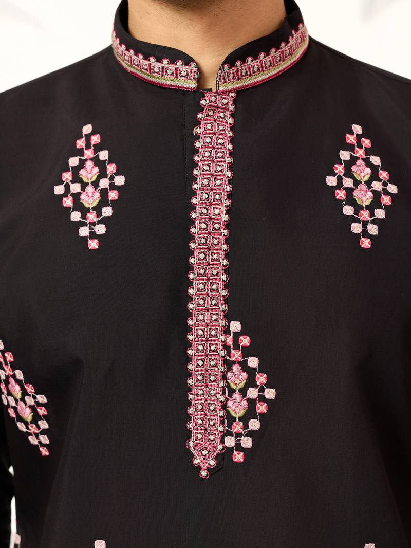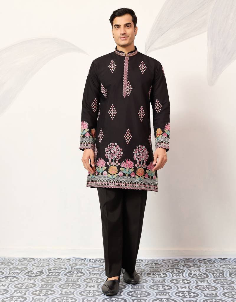 | Product Name | Black Viscose Silk Thread & Sequins Embroidered Work Wedding Festival Marriage Party Wear Straight Mens Kurta | |