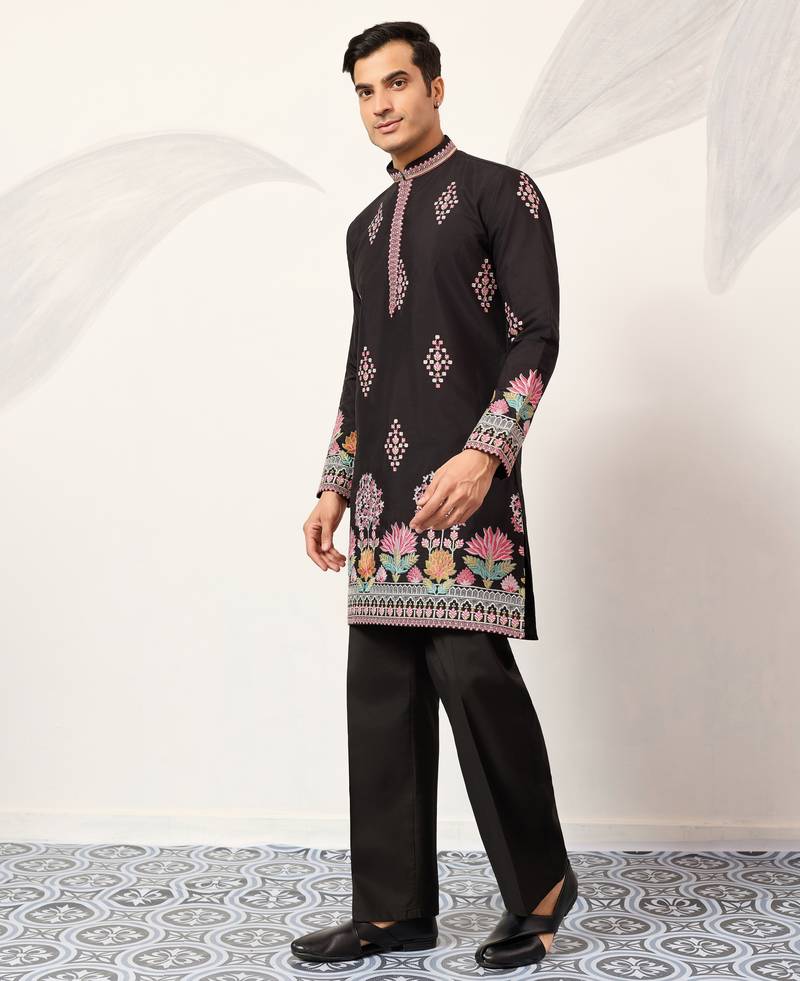 Black viscose silk thread & sequins embroidered work wedding festival marriage party wear straight mens kurta