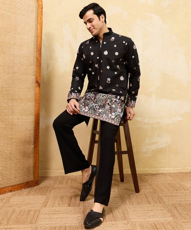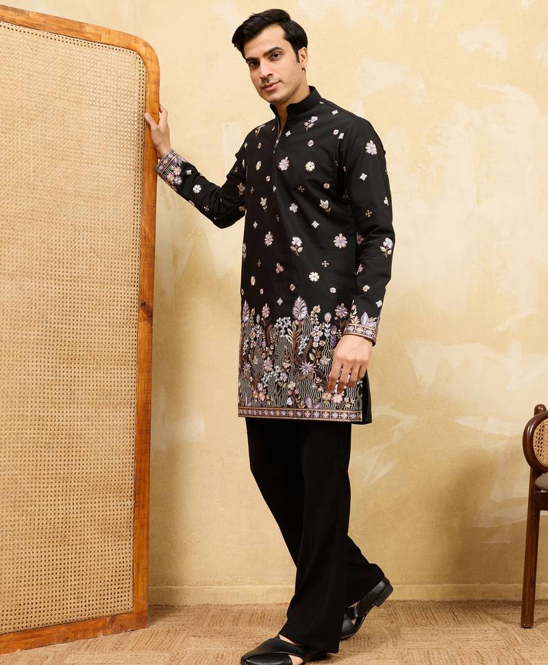 | Product Name | Black Viscose Silk Thread & Sequins Embroidered Work Wedding Festival Marriage Party Wear Straight Mens Kurta | |