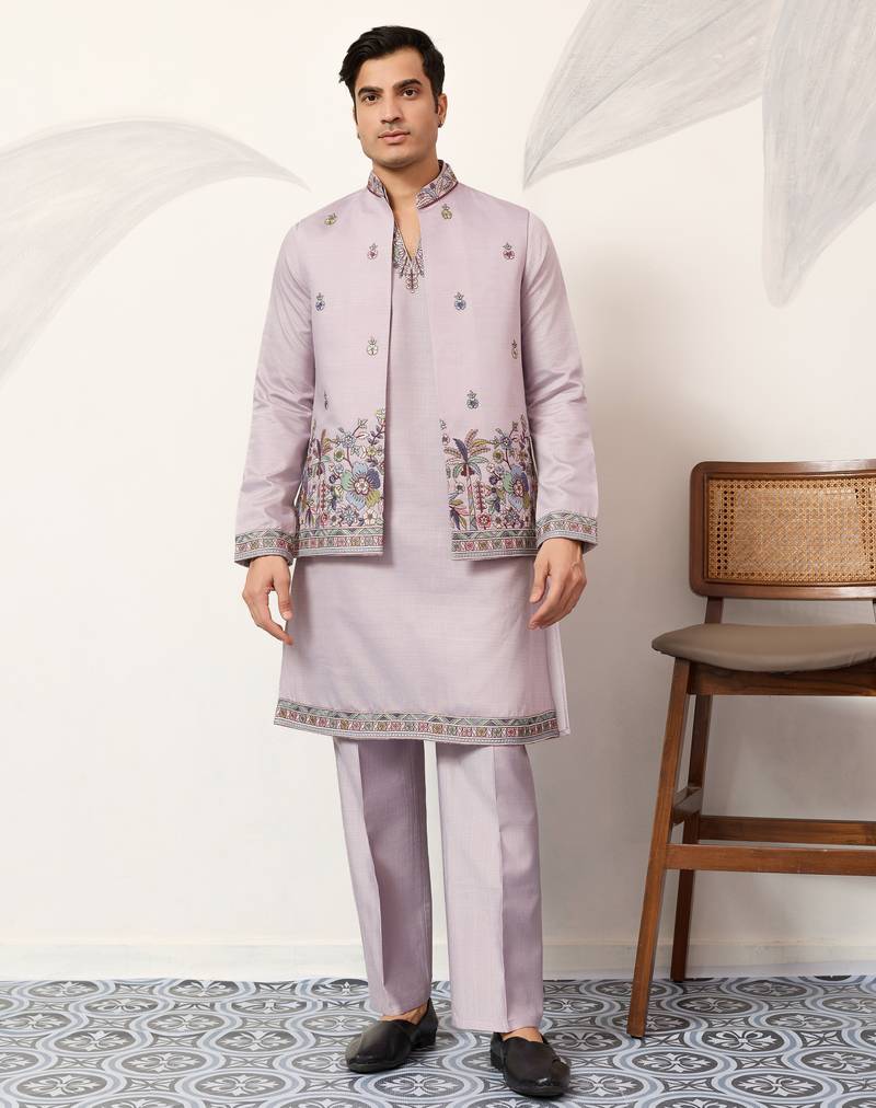 Lavender viscose silk thead with sequins embroidered work wedding function festival party wear straight kurta pant koti
